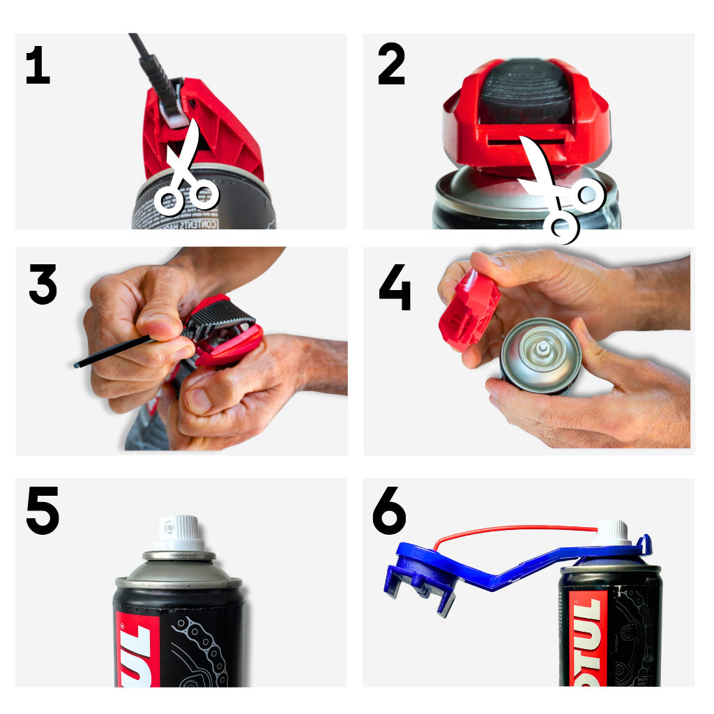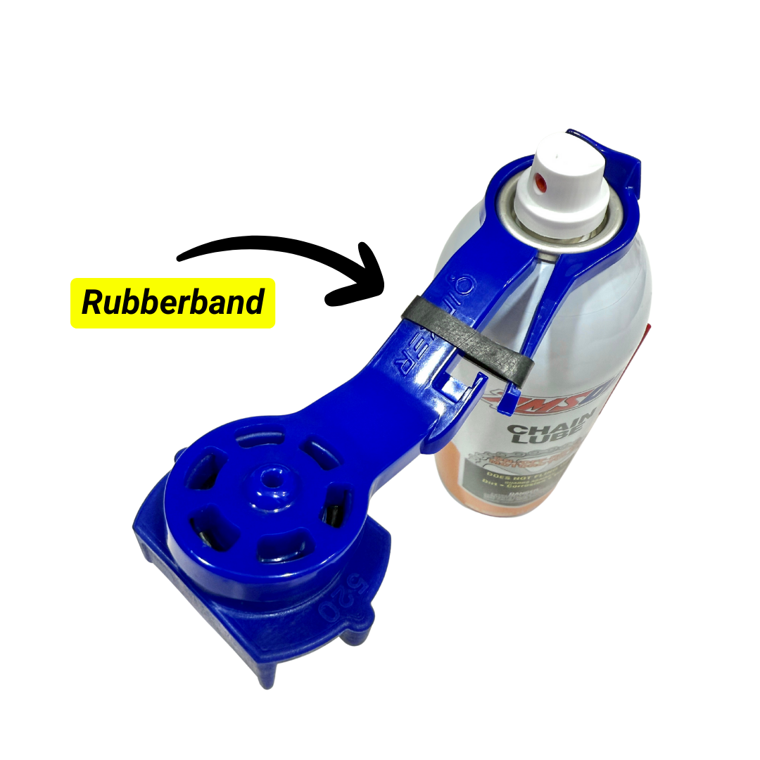 Attach Oinker to your aerosol can, position the center guide over the chain rollers, and rotate the wheel or pedal.